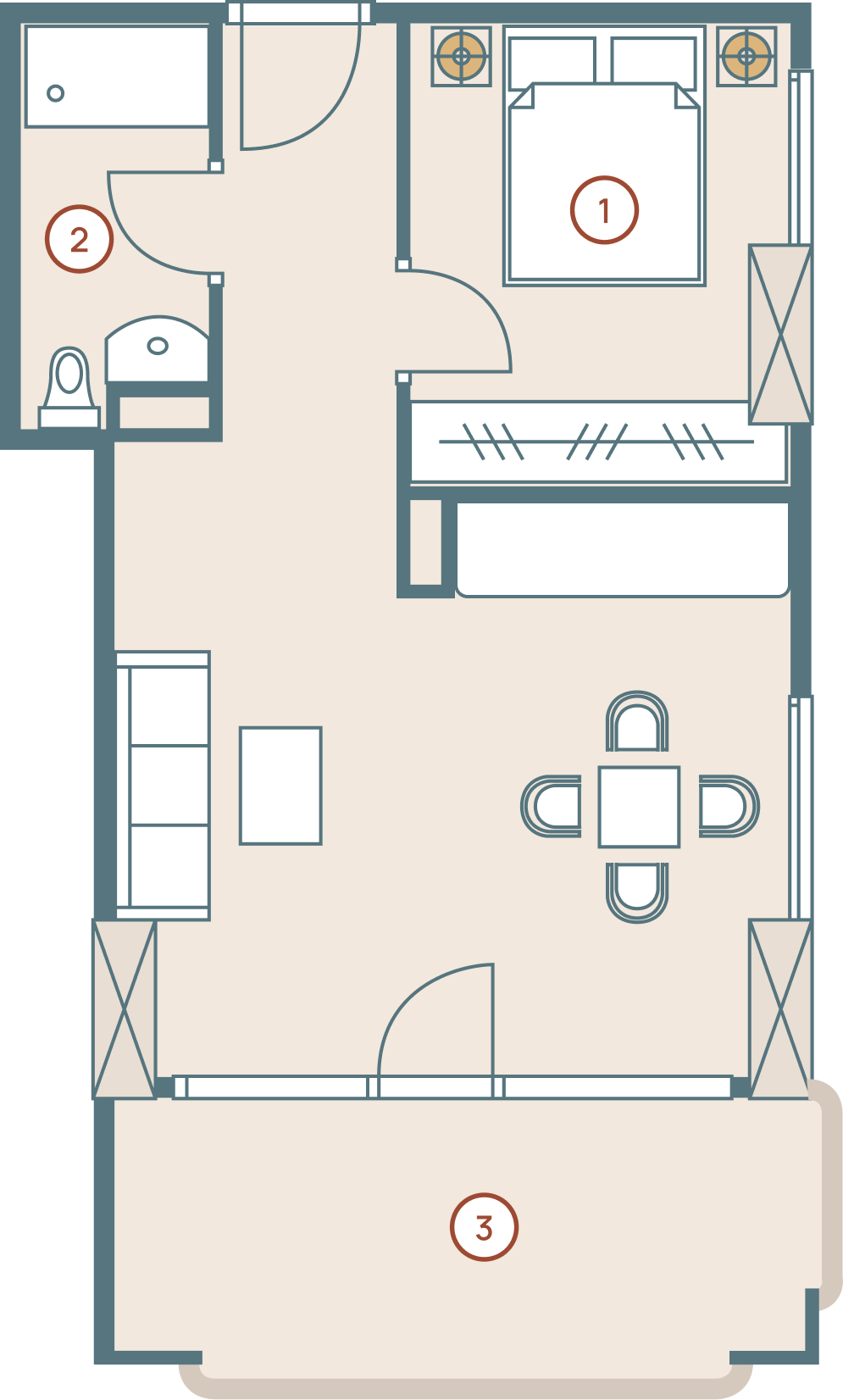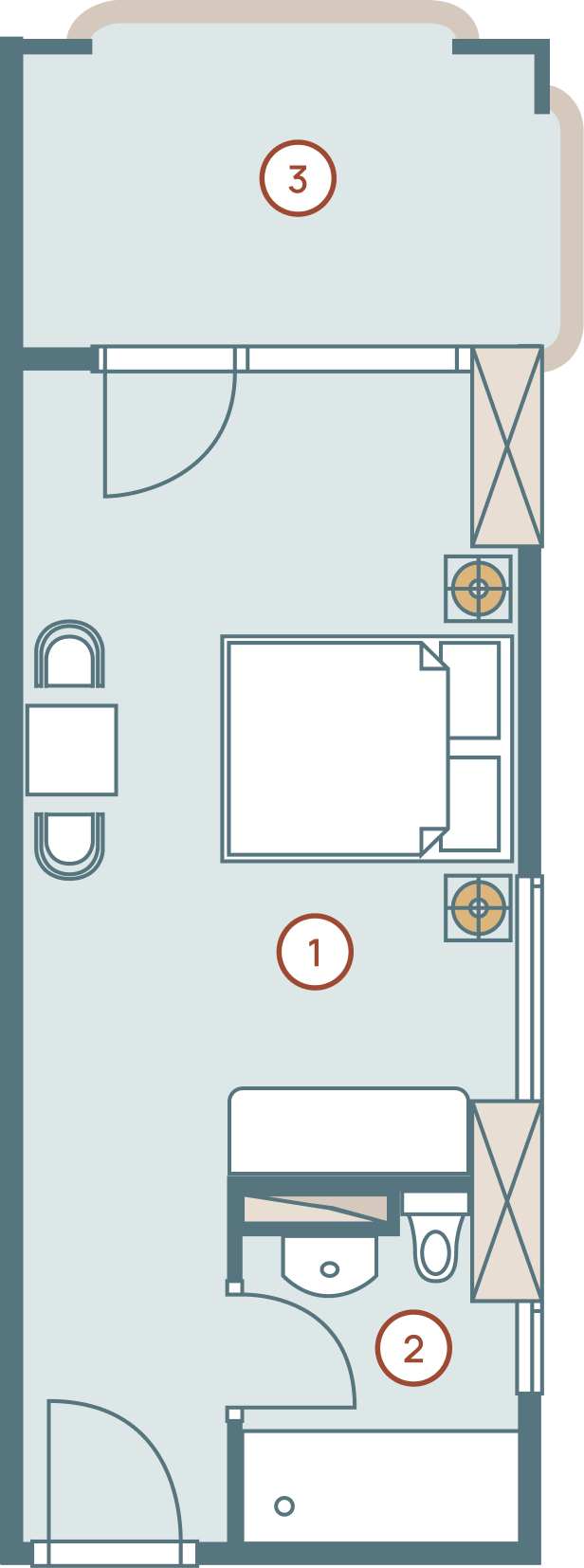 Номер с отдельной спальней и просторной гостиной. Из каждого номера открывается прекрасный вид на море и горы.