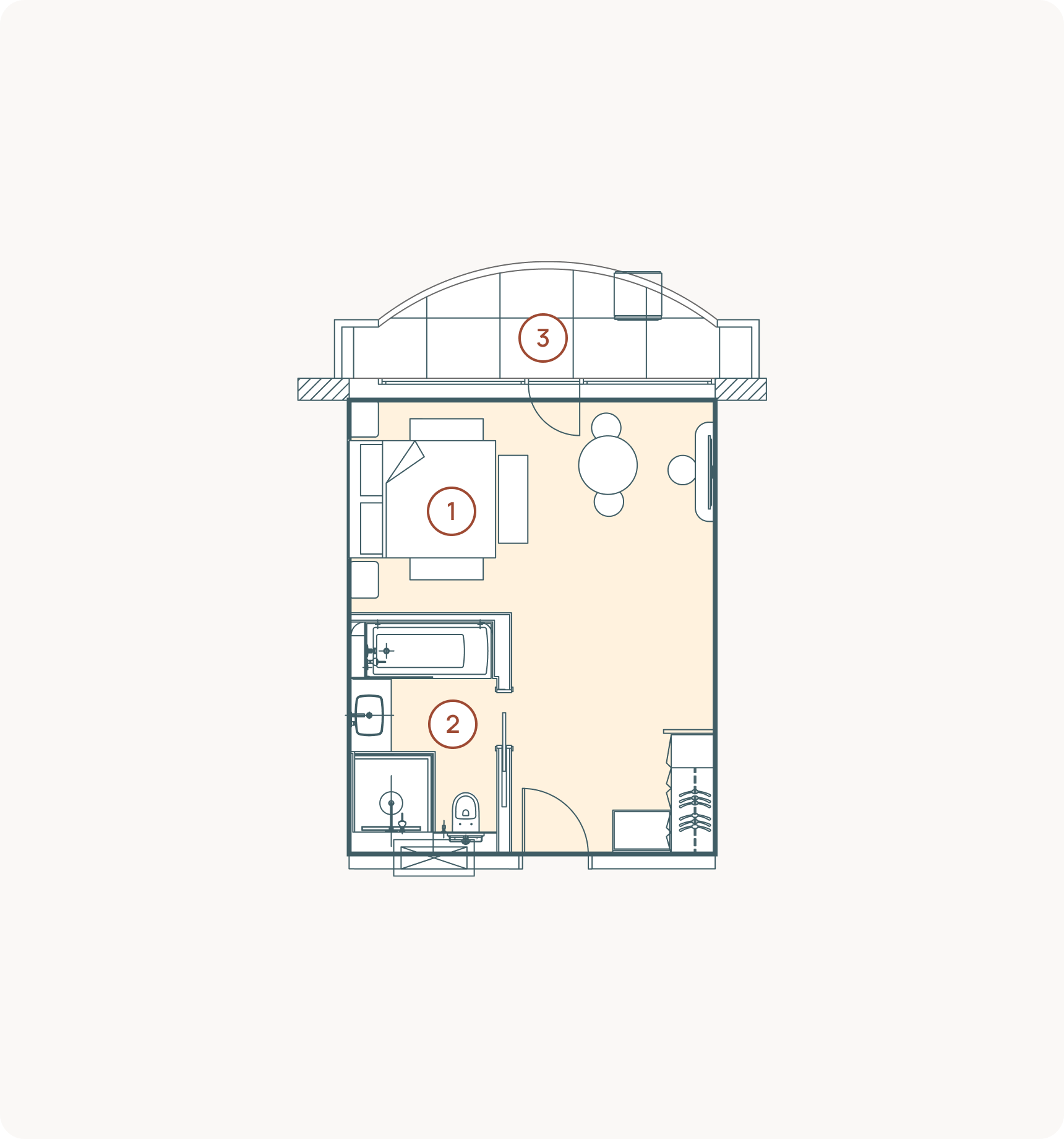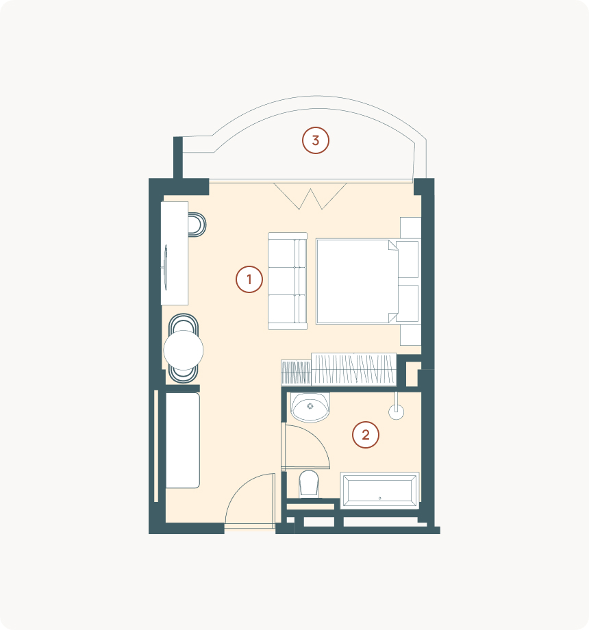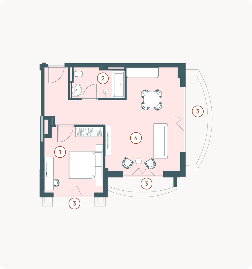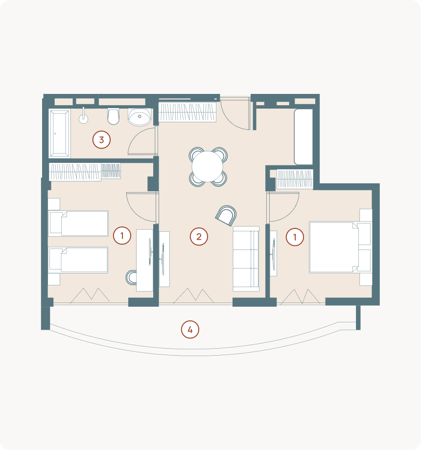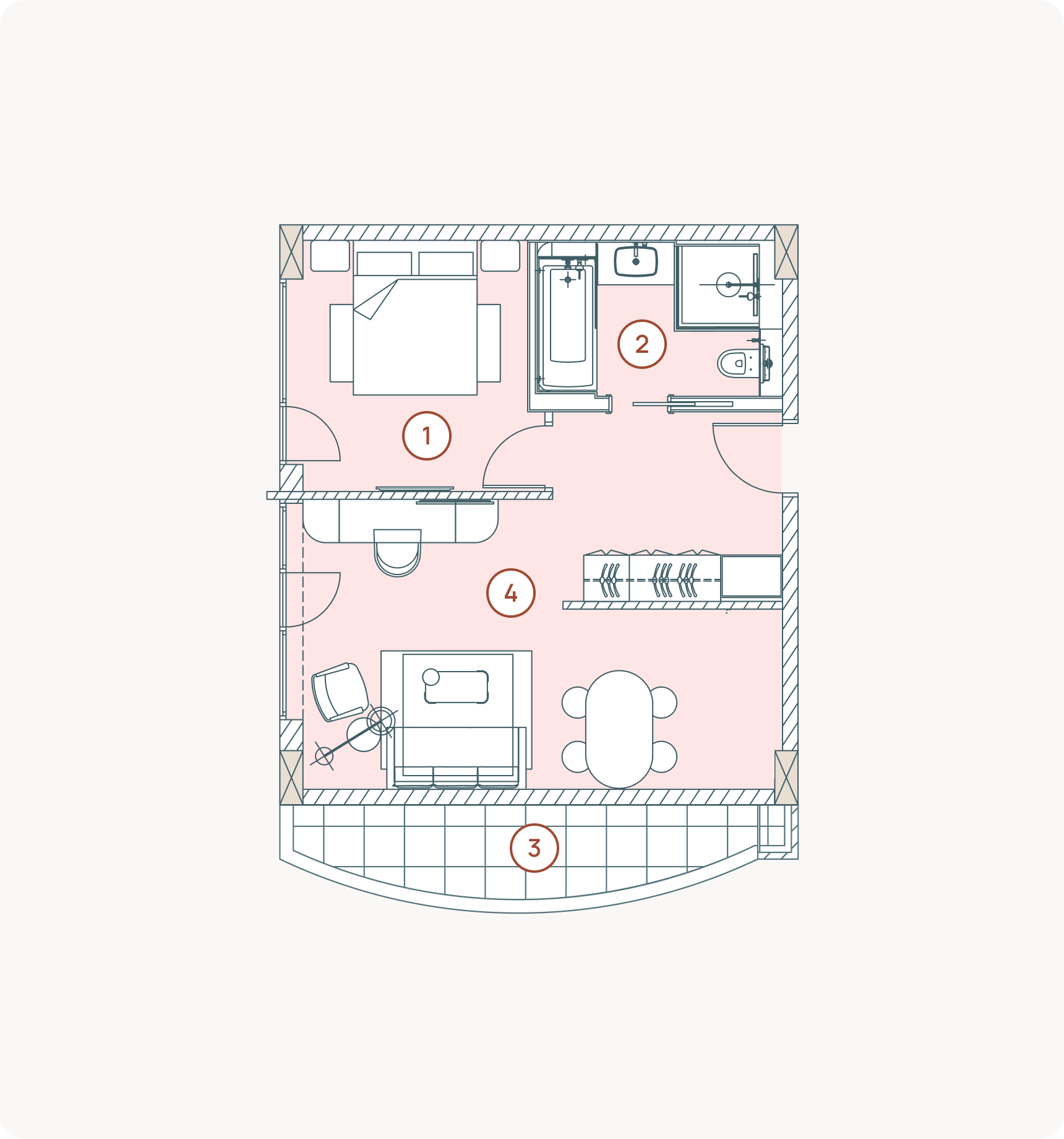 Номер с отдельной спальней и гостиной с зоной кухни. Просторная планировка позволяет комфортно разместить до 4 человек.