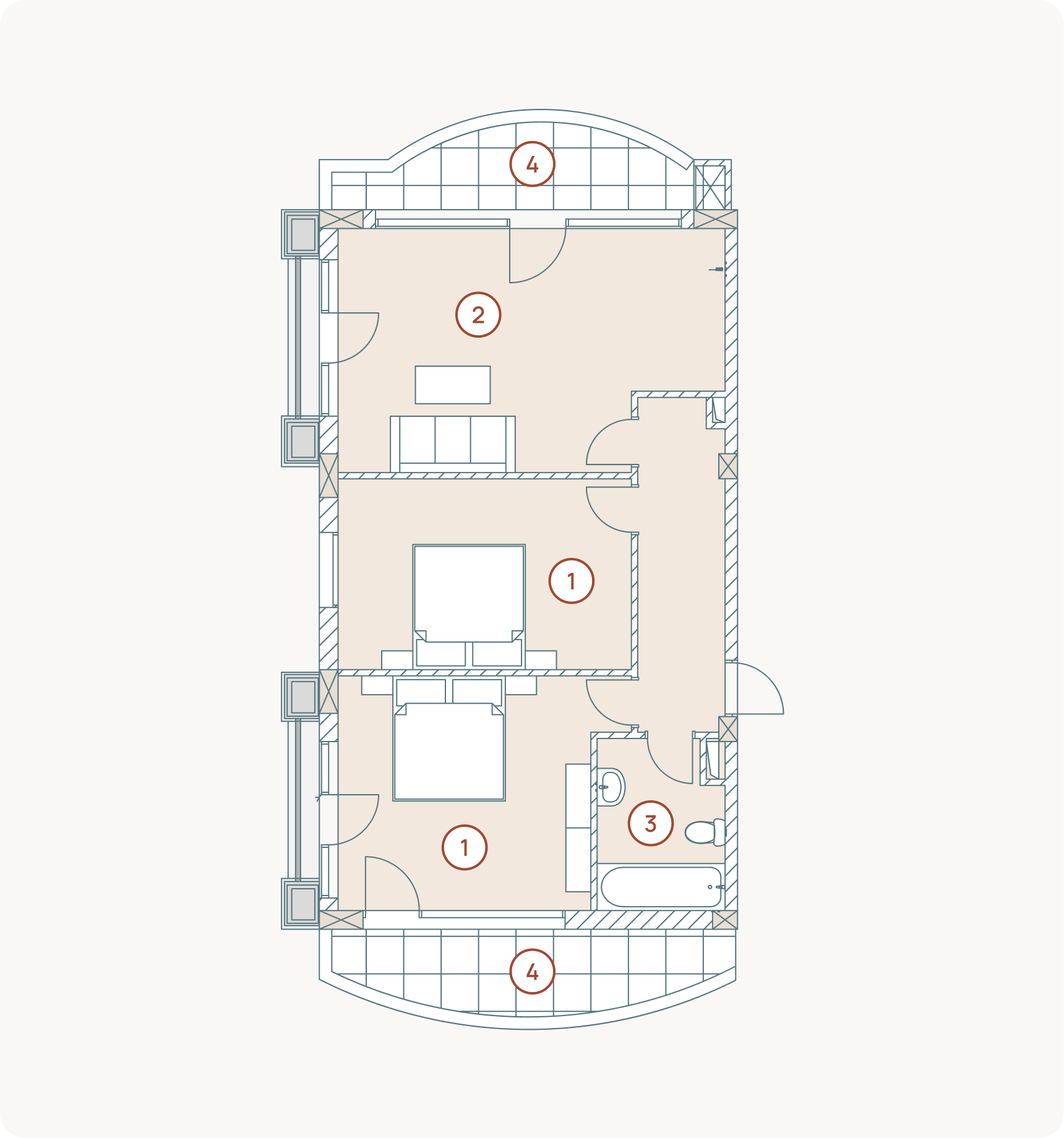 Номер с отдельной спальней и гостиной. Просторная планировка позволяет комфортно разместить до 4 человек.