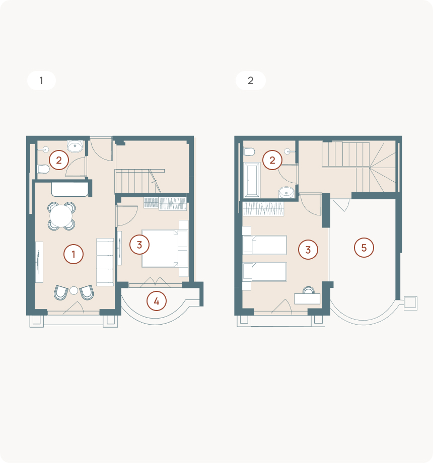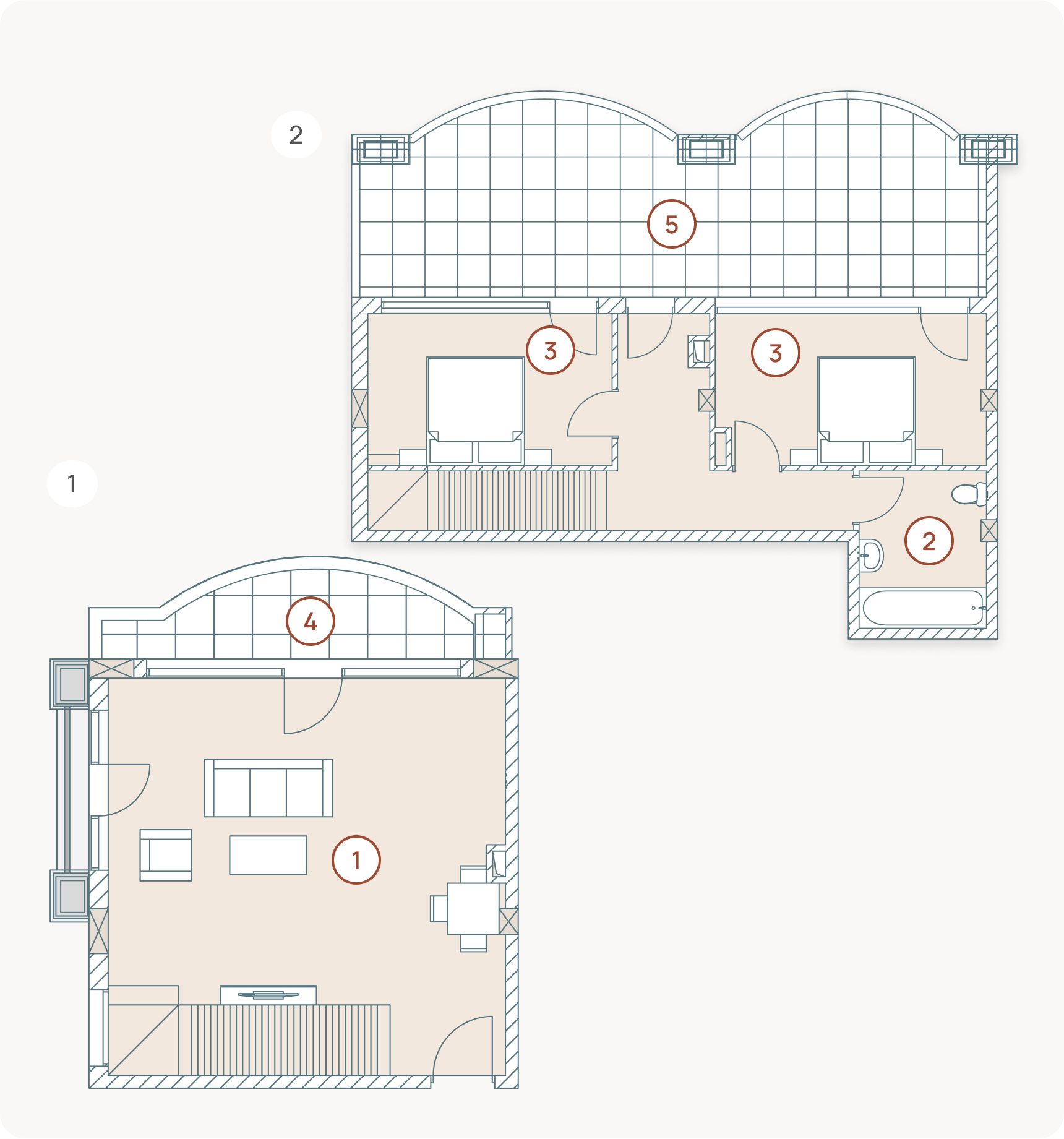 Просторный двухэтажный номер с двумя отдельными спальнями и гостиной. На втором этаже пентхауса находится большая терраса с прекрасными видовыми характеристиками.